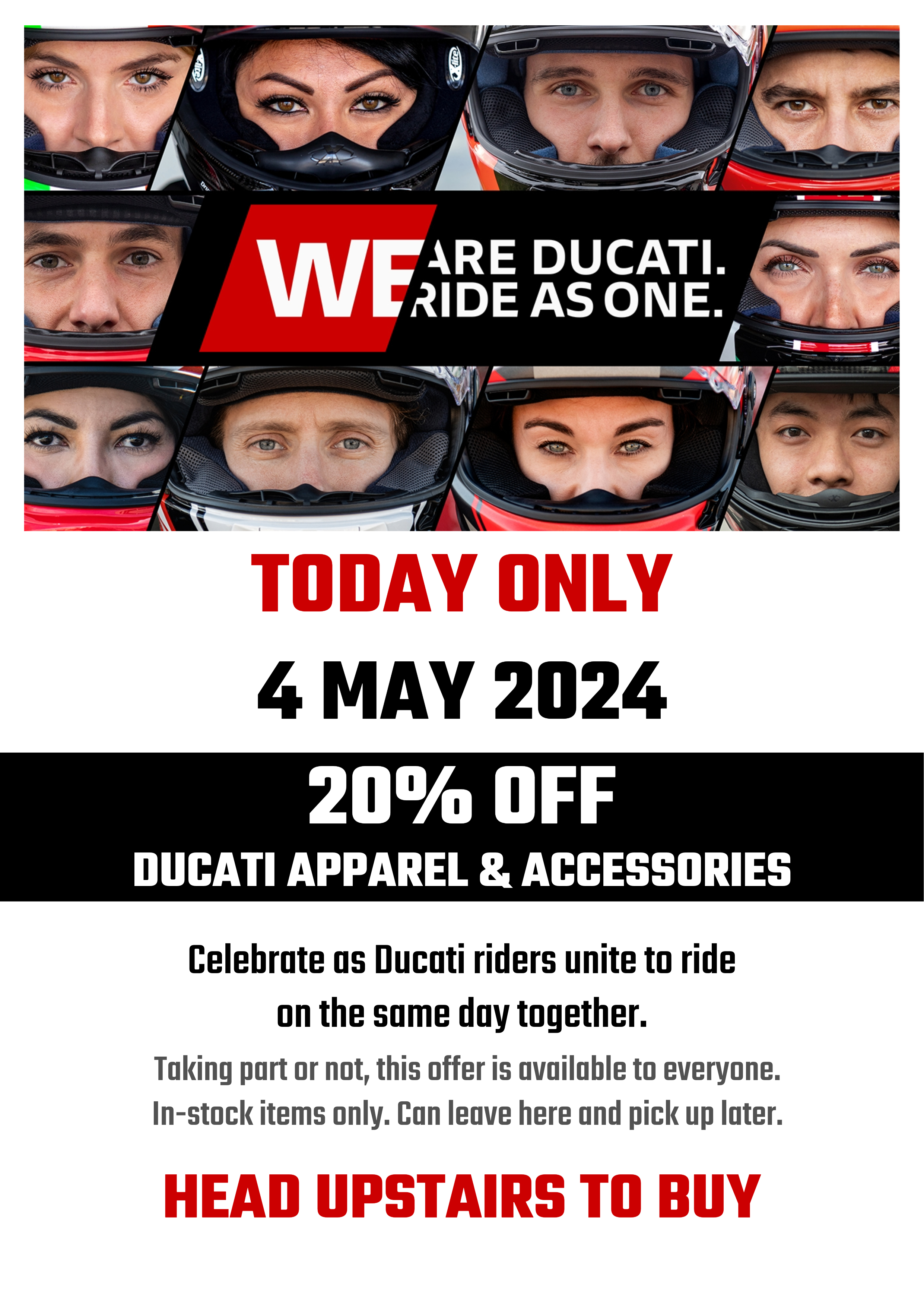 ONE DAY ONLY. 20% discount on all in-stock* Ducati apparel and accessories. There will be time to purchase prior to riding (if you turn up when the store opens) and you're welcome to leave what you purchase here until another day to collect.
