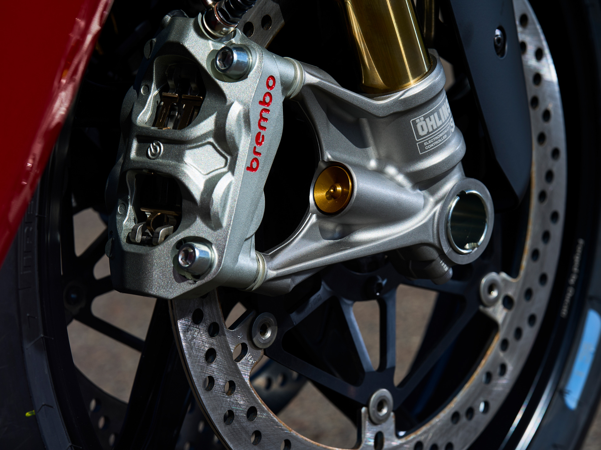 Spec-up to the V4 S and you score Öhlins NPX front forks and rear Öhlins TTX36 shock, electonically managed by the Öhlins Smart EC3 semi-active controller. Complimenting this is the Öhlins steering damper.