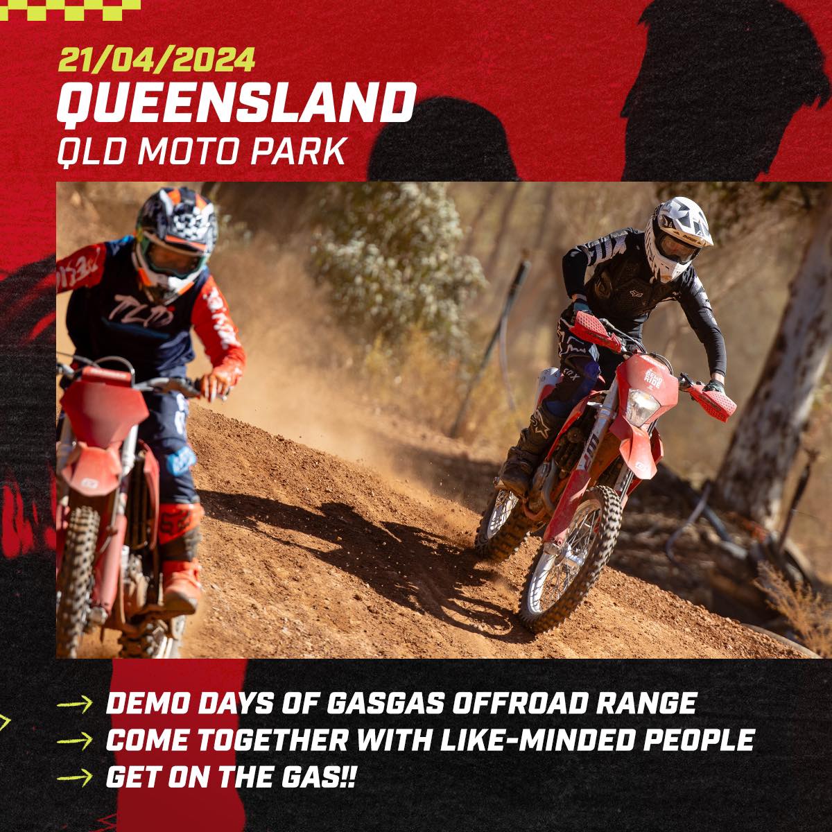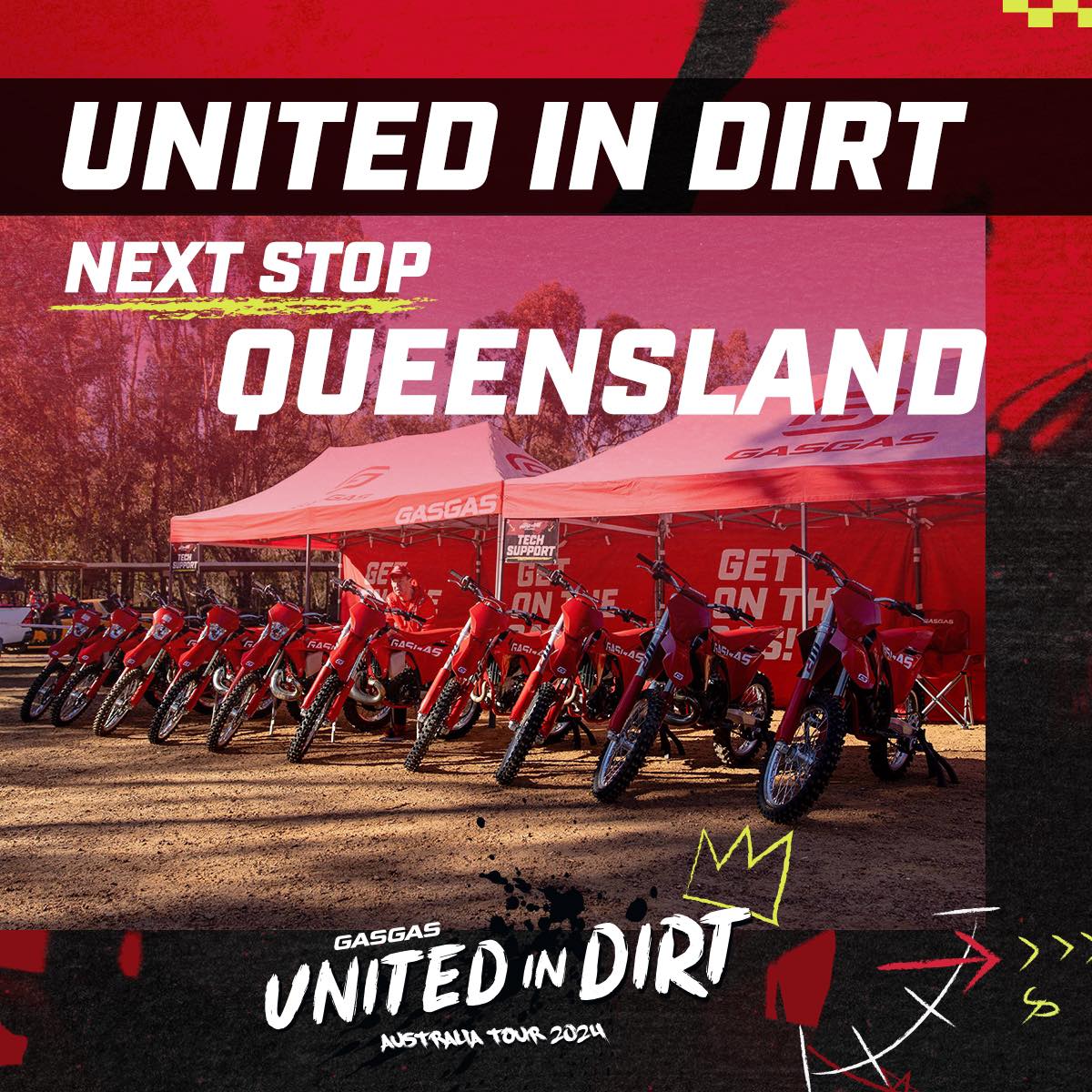 The date is Sunday 21 April 2024. Queensland Moto Park is the location. The red-hot line up is the GASGAS branded weapons.