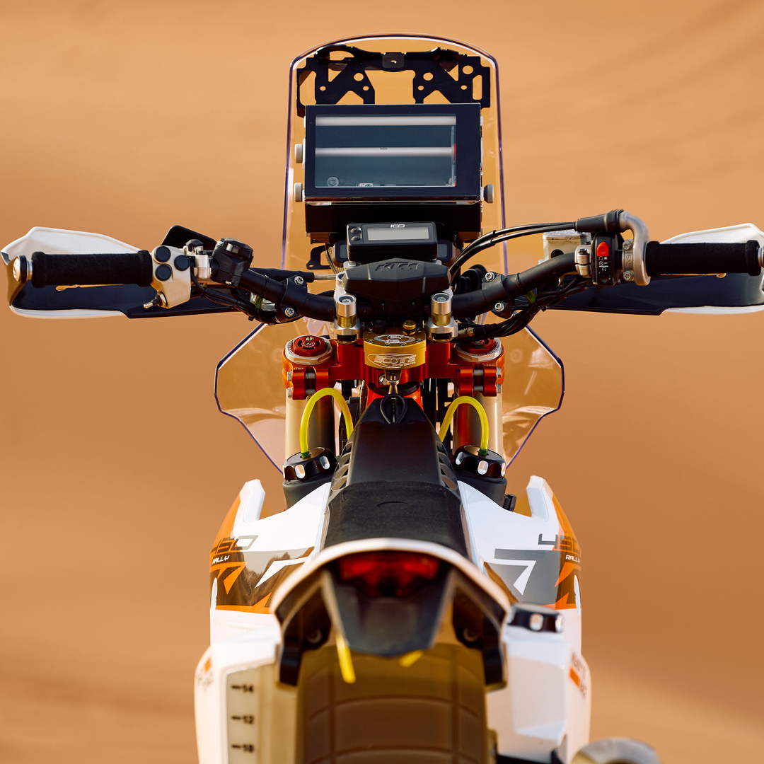 From a handling perspective, the 2025 KTM 450 RALLY REPLICA is fitted with the latest WP PRO COMPONENTS. In the front, 48 mm WP XACT PRO 7548 closed cartridge cone valved fork is clamped into a new 23 mm offset, CNC machined triple clamps ensuring optimal stiffness. The upper clamp also boasts an in-house developed PHDS system, fitted with a SCOTTS steering damper.