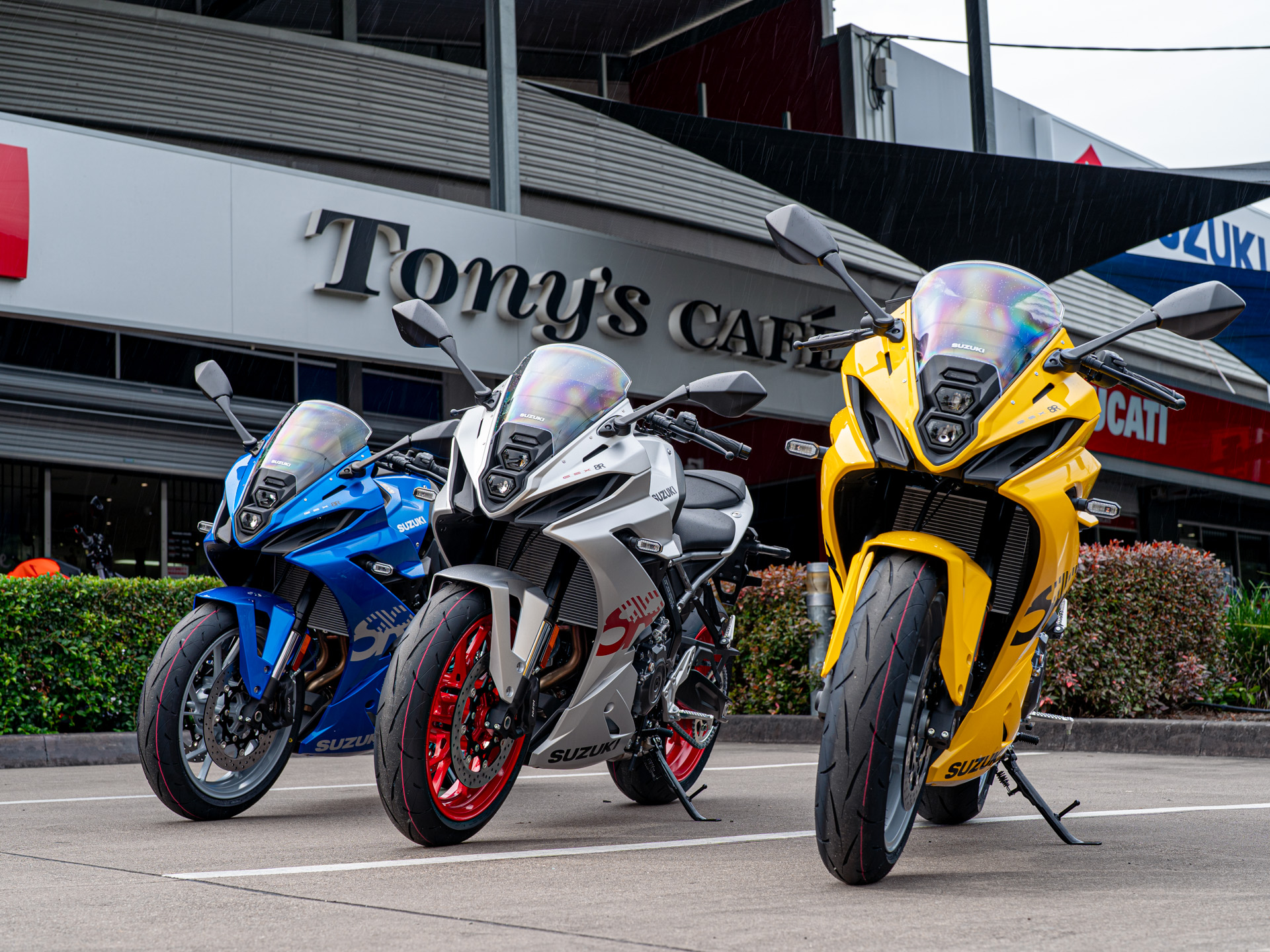 The fairing, Showa suspension setting and mildly lower bar position differentiates the two, plus LED blinkers on the 8R if you are narrowing it down on a quickvisual, plus further details we won't bore you with here.