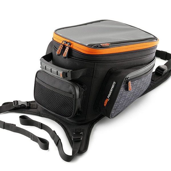 Take your essentials with you with ease. The KTM Tank Bag is designed to be fitted to your KTM Street and Adventure bikes efficiently. With extremely robust fasteners with large zip pullers, compartments can be accessed without the need to remove gloves. Carry strap and rain cover included. The ideal companion for every tour.