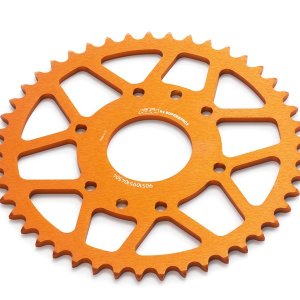 The KTM Rear sprocket is an ideal choice for replacing your old, worn-out sprocket. This product offers a range of features that make it the perfect replacement part. Firstly, it has been constructed from high-quality steel to provide superior durability and performance in any riding conditions. Secondly, its tooth profile and construction allows you to maintain maximum power delivery even under extreme loads, ensuring your rear wheel always maintains traction for better control and acceleration when you need it most.. Its light weight design helps to reduce rotating mass on your bike which helps with suspension compliance over rough terrain as well as improved fuel efficiency.