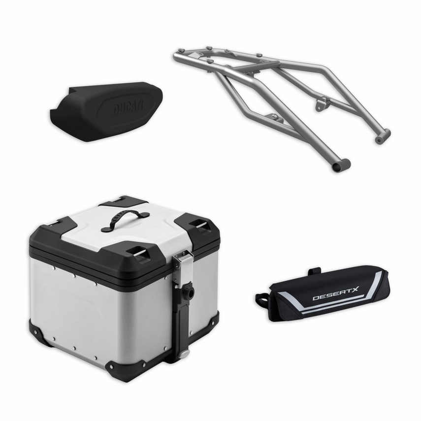 The package contains: aluminium top case, top case plate, cushion for aluminium top case, handlebar bag.