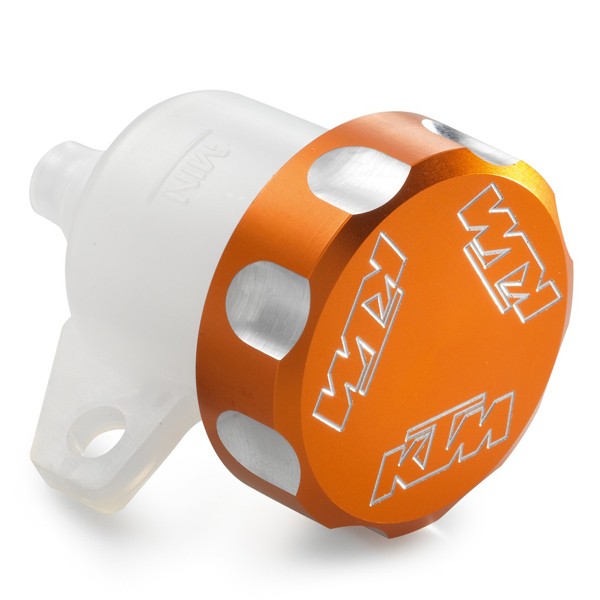 This KTM Brake Fluid Reservoir has a cap in KTM's signature bright orange colour.