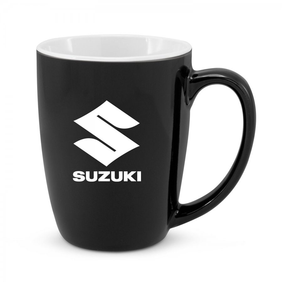 Round 330ml stoneware coffee mug with a contoured base which is presented in a black gift box. Black on the outside and white on the inner. This product is not dishwasher safe and handwashing is recommended. Printed logo to one side.